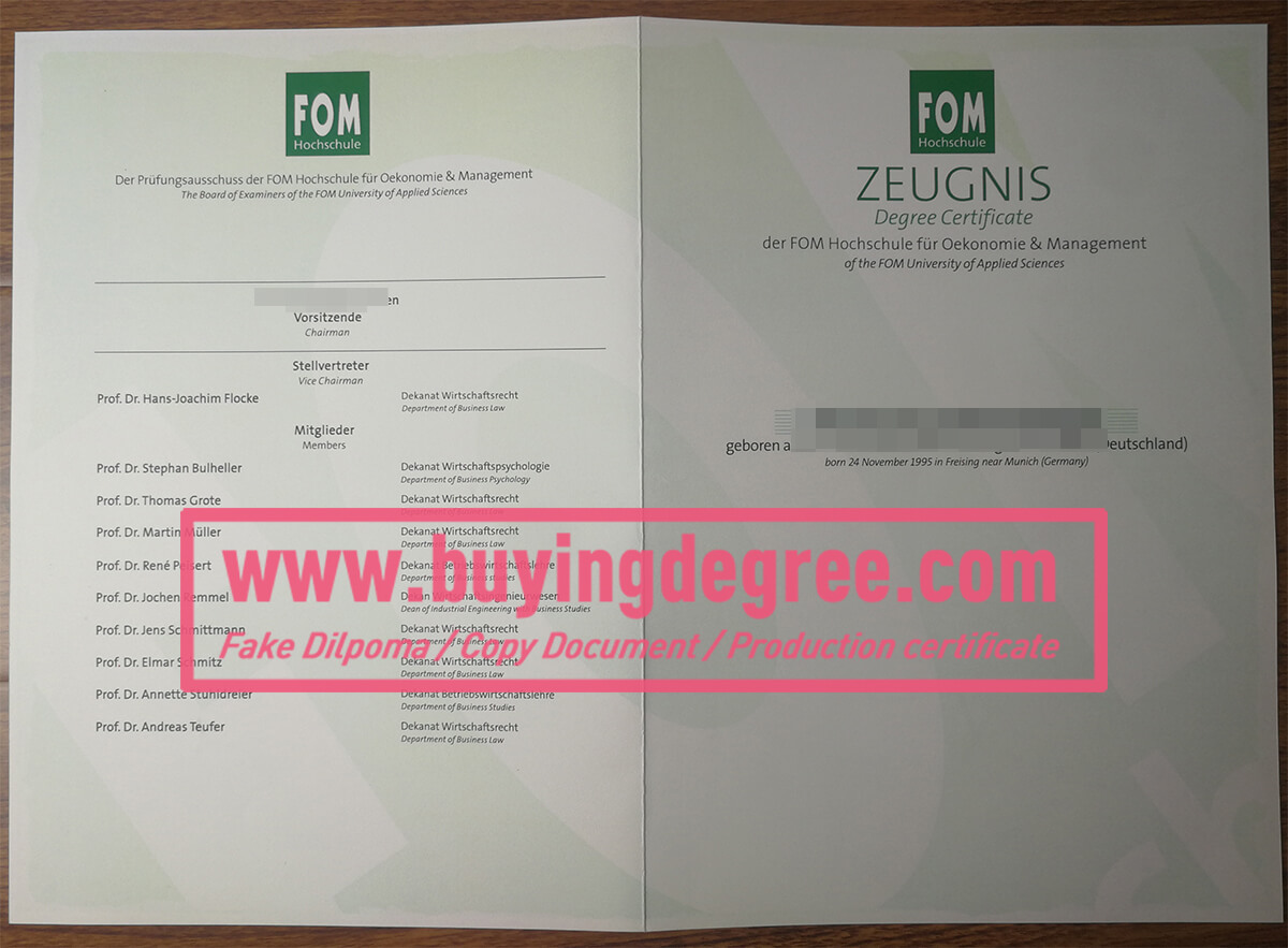 How to get fake FOM official transcript at low price? find college transcript maker free to fake college transcript generator free. get a PDF of fake official transcript. FOM University mainly provides postgraduate study opportunities for employees, where students can earn a German or international university degree while working. The school has strong faculty, including university professors with rich teaching experience and business experts with rich management experience and academic qualifications. At present, FOM has a total of 150 university professors, including 40 full-time professors and more than 500 visiting professors. FOM universities are located in Berlin, Bremen, Bochum, Dortmund, Duisburg, Düsseldorf, Essen, Frankfurt, Gütersloh, Hamburg, Cologne, Leverkusen, Marl, Munich, Nuremberg, Neuer s. There are campuses in 17 cities including Noyce and Saigon. Headquartered in Essen, FOM University offers diplomacy courses accredited by the German government.